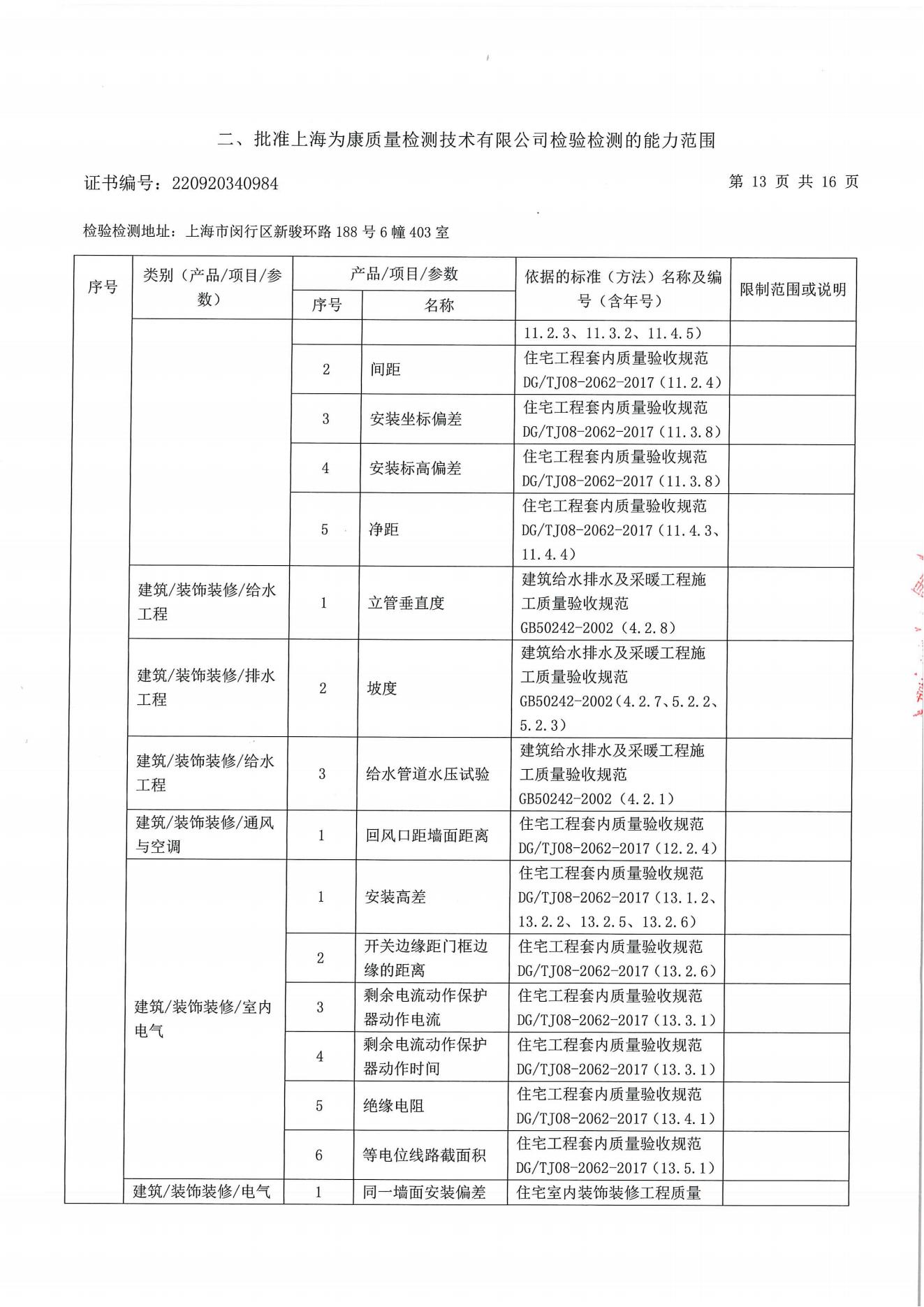 分戶驗收要求 分戶驗收:即交房前依照相關標準對區域內住宅逐套進行驗收。自2009年10月1日起所有上海市住宅工程強制實施分戶驗收。《上海市工程質量分戶驗收管理規定》住宅工程竣工驗收前必須依照《住宅工程套內質量驗收規范》DG/TJ08-2062-2009和現行工程質量標準、規范,對每戶套內的觀感質量、使用功能及使用安全進行驗收。凡未實施分戶驗收的,該工程項目將不得交付使用;服務范圍 一、裝修房全過程跟蹤檢查:從毛坯到裝修結束全過程跟蹤檢驗;對隱蔽工程施工進行檢測;對裝飾 材料進行控制;每個施工節點作好原始記錄并提出整改意見;待整改結束進行復查,直至符合 要求;最終每戶出具一份檢測報告。 二、裝修房竣工驗收:主要對安全、使用功能及表面觀感質量進行檢測;每個施工節點作好原始記錄并提出整改意見;待整改結束進行復查,直至符合要求;最終每戶出具一份檢測報告。 三、毛坯竣工驗收:主要對安全、使用功能及表面觀感質量進行檢測;每個施工節點作好原始記錄并提出整改意見;待整改結束進行復查,直至符合要求;最終每戶出具一份檢測報告。 四、個人交房驗房檢測。 建設工程分戶驗收檢測參考標準 DG/TJ08-2062-2017 《住宅工程套內質量驗收規范 》 DB/T 31/30-2003《住宅裝飾裝修驗收標準》 GB50209-2002《建筑地面工程施工質量驗收規范》 GB50210-2001《建筑裝飾裝修工程質量驗收規范》 GB20242-2002《建筑給排水及采暖工程施工質量驗收規范》 GB50300-2001《建筑工程施工質量驗收統一標準》 GB50303-2002《建筑電氣工程施工質量驗收規范》 套內質量檢測(一房一驗)內容 檢測內容 建筑尺寸 室內地面:水泥砂漿地面、木、竹地板,板塊地面 室內頂棚:頂棚抹灰、吊頂工程 室內墻面:墻面抹灰、飾面板(磚)墻面、涂飾工程、裱糊工程、軟包工程 建筑門窗 樓梯與護欄 細部工程:櫥、柜,窗簾盒、窗臺板、門窗套、可折裝式隔斷、淋浴房 給排水與燃氣:室內給水、室內排水、衛生器具、燃氣管道 通風與空調:送排風和防排煙、空調工程、 室內電氣:燈具安裝、開關、插座,分戶配電箱、室內配線、等電位聯結 弱電工程:有線電視安裝工程、電話、信息網絡安裝工程,訪客對講安裝工程、安防報警系統 太陽能熱水系統 室內環境評價